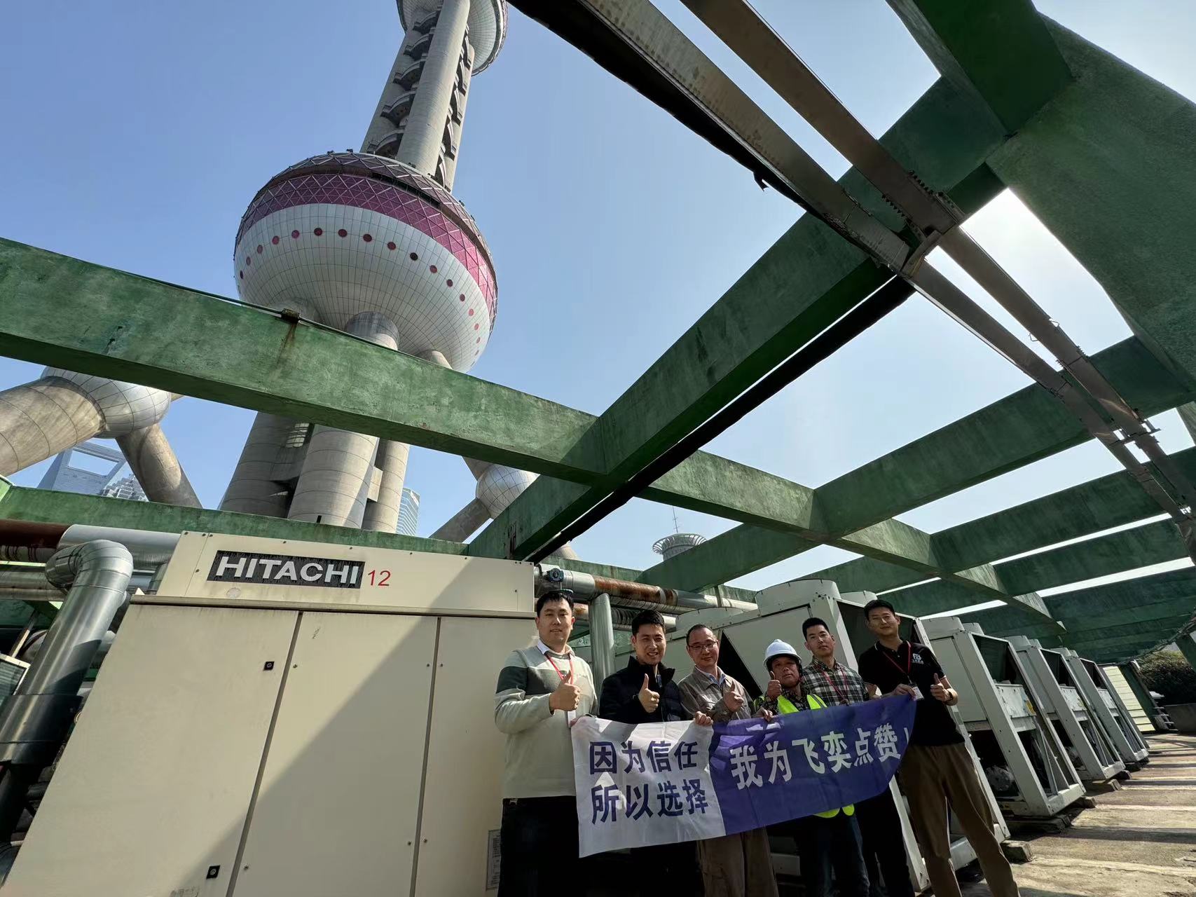 他們帶著產(chǎn)品登頂東方明珠塔,經(jīng)過二十分鐘左右的操作,順利將日立和開利的風(fēng)冷螺桿式冷水機組完成對接,并調(diào)試成功。