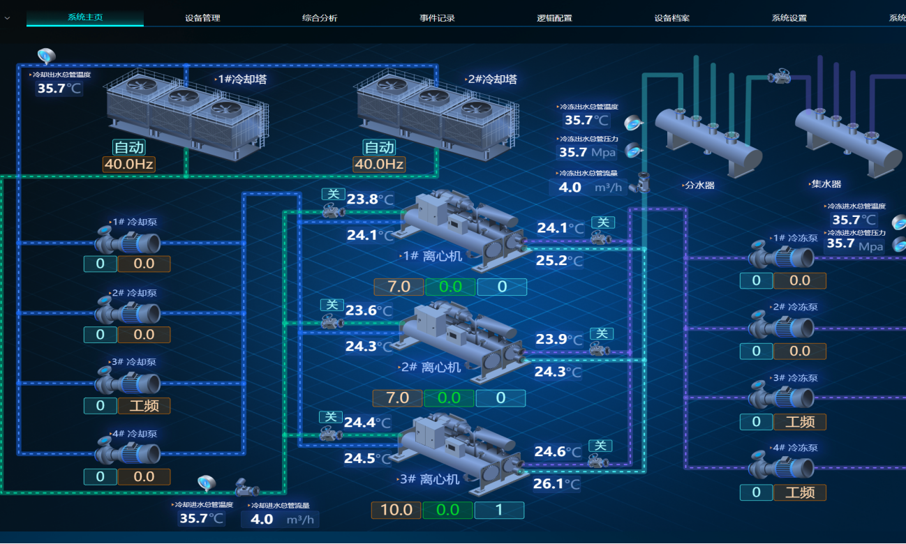 飛奕科技成功對接并高效控制了院方現有的約克磁懸浮主機,為本項目部署飛奕機房群控系統,該系統將作為核心“智慧大腦”,統一匯集所有數據并實現對整個空調系統(冷熱源、輸配系統、末端設備)的集中化協同控制。通過部署智能傳感網絡,持續采集環境溫度及設備運行狀態等數據,并實時上傳至飛奕科技的智控系統平臺,利用先進的AI算法模型,結合醫院不同科室(如手術室、病房、門診區)的環境需求與實時狀況,自動調節溫度,實現精準控溫。